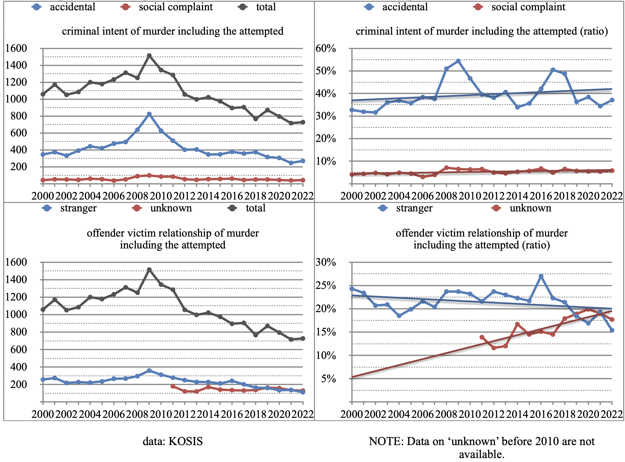 Abnormal motive crimes are related to crimes that are either accidental, motivated by social grievances, or crimes in which the perpetrator and the victim have no prior relationship. The occurrence of accidental murders and attempted murders has decreased since 2000, while crimes motivated by social complaints have remained stable. Specifically, due to the overall decrease in the incidence of crimes, the proportion of both types of crimes has increased. On the other hand, in crimes where the victim did not have a personal relationship with the offender, the number of crimes committed by strangers decreased slightly, while the number of crimes committed in an unknown relationship increased significantly.