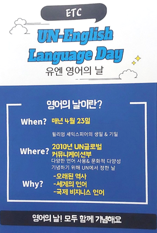 ETC is a club that engages in English translation (TED Translation) activities, including lectures and convention translations at Michuhol Foreign Language High School. In line with this purpose, the club organized a campaign to celebrate and spread the United Nations English Language Day. At the moment education, they explained when UN English Language Day is, why it was designated, and what it means. They also used a simple card game to increase interest in the activities and remind them of the day's meaning.